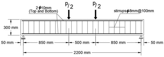 The beams underwent the mixing, casting, and compaction processes at a temperature of 23 °C. A rotary-style mixing apparatus was utilized to formulate the concrete mixes. These mixes were then arranged into three layers, followed by the application of vibration and compaction using a specialized tool. The top layer was meticulously leveled to achieve a smooth surface texture. In the creation of beams, a consistent concrete mixture was used to cast cubes, cylinders, and prisms. To ensure proper curing, the concrete cubes, cylinders, and prisms were submerged in a water reservoir for 28 days. Subsequently, they were transitioned to an open-air environment until the scheduled testing date. The evaluation of the concrete’s hardened properties was based on the analysis of these test specimens. Compressive strength was determined by testing three concrete cubes, resulting in an average compressive strength of 30.8 MPa. The tensile strength was determined through the indirect tensile test on three concrete cylinders, yielding an average splitting tensile strength of 2.63 MPa. The flexural strength of concrete was assessed by testing three concrete prisms under 3-point bending, with an average flexural strength of 5.49 MPa.
