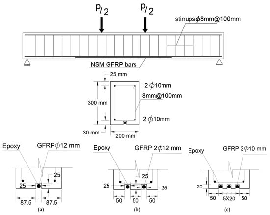 Presently, there is an increasing demand to enhance global infrastructure. There are various approaches to fortifying reinforced concrete structures, with externally bonded reinforcement (EBR) [,] and the near-surface mounted (NSM) method emerging as the most commonly employed. In numerous countries, the NSM method has been applied for the repair and strengthening of structural elements, proving to be a promising technique for augmenting the load-bearing capacity of reinforced concrete (RC) beams. The implementation involves two key stages: initially, grooves are incised into the concrete cover of RC elements, followed by the insertion of Fiber Reinforced Polymer (FRP) rods into these grooves, securely bonded with epoxy resin. The NSM method holds great promise for the rehabilitation of RC members, with several researchers highlighting its advantages over conventional methods [,,,,]. Several laboratory studies have been conducted to analyze the bonding characteristics between NSM FRP bars and concrete. These investigations have also explored the impact of different factors, such as the FRP anchorage system, NSM FRP length, epoxy type, groove dimensions, composition of rebars, and the compressive strength of concrete [,,,,,]. Considerable scholarly efforts have focused on improving the bonding effectiveness to enhance the flexural and shear capabilities of reinforced concrete beams undergoing strengthening procedures. The NSM strengthening technique presents a viable alternative to the EBR technique. In NSM, the surrounding concrete acts as a protective layer for NSM bars or strips, shielding them from environmental, thermal, and mechanical damage. This, in turn, helps to delay or prevent premature failure. The initial experiments on this technique were conducted by Nguyen et al. [], who utilized CFRP strips placed in grooves cut into concrete specimens. Numerous other experimental studies have investigated the flexural properties of RC beams strengthened with NSM bars or strips composed of FRP materials [,,,]. While FRP reinforcement offers benefits, such as lightweight design, high corrosion resistance, and potential durability, it comes with a significant cost. Moreover, FRP reinforcements exhibit limited ductility. Previous studies have indicated that the effectiveness of NSM FRP strengthening is restricted in reaching its maximum tensile strength due to premature failure caused by FRP debonding or modes of concrete splitting failure [,,,]. Recent studies have explored the effects of mechanical properties, the cross-sectional area of FRP bars, and the type of adhesive epoxy on the flexural strength of beams. This research focuses on how these factors influence the load-bearing capacity of beams when subjected to the NSM technique. The findings emphasize the substantial impact of the stiffness of FRP bars on the maximum load of beams reinforced through NSM FRP. The length of the GFRP bars used for NSM reinforcement plays a crucial role in determining the effectiveness of the reinforcement mechanism. Longer bars provide greater bonding lengths and increase the adhesive surface area, resulting in a higher maximum load. However, it is essential to carefully choose the bonding length to fully utilize the potential of GFRP bars while avoiding premature bond failure. The quantity of GFRP bars used for NSM strengthening also plays a significant role in overall performance. The addition of more bars can enhance the structural capacity to withstand bending and shear forces by distributing the applied loads more evenly. Nevertheless, an excessive number of bars may lead to congestion and insufficient cover, potentially compromising the bond strength and overall durability of the system [,].