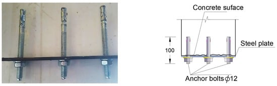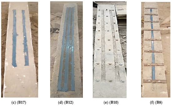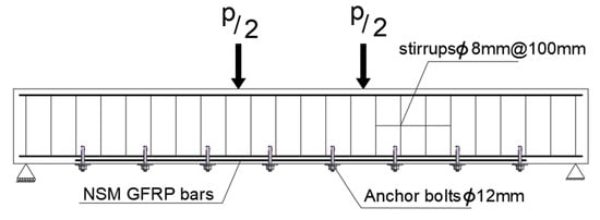 The grooves were partially filled with epoxy, followed by the placement of the GFRP rods into these grooves. Once the rods were correctly positioned, the remaining grooves were also saturated with the adhesive substance, and the external surface was leveled and smoothed, as illustrated in Figure 5. After a period of 7 days, the anchoring plate was securely fixed to complete the procedure using bolts. To ensure a reliable grip, the grooves were partially occupied with epoxy adhesive, and the rods were meticulously positioned and securely embedded in the adhesive. Following the proper placement of rods, the remaining grooves were infused with the adhesive substance, and the exterior surface was leveled and smoothed, as shown in Figure 5. Subsequently, ample time was allowed for the beams to achieve their maximum adhesive potency, spanning over a week. The anchoring plate was then affixed and firmly secured using bolts to finalize the procedure.