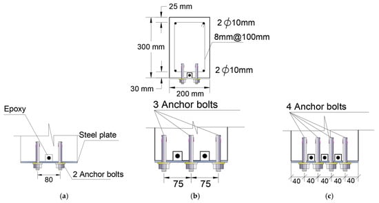Details of the strengthened beam with anchor (a) 2 anchor bolts, (b) 3 anchor bolts and (c) 4 anchor bolts (all dimensions are in mm).