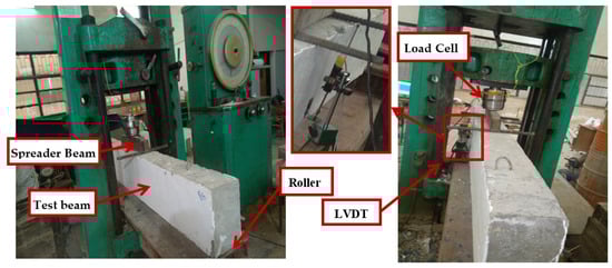 Testing the beams involved the use of a robust steel spreader beam to apply the load. A load cell was positioned between the steel spreader beam and the machine, as illustrated in Figure 6. The vertical deflection of the beams at the mid-span was measured using linear variable differential transformers (LVDTs). Additionally, an electrical strain gauge with a 6-mm attachment was employed to measure the strain deformation at the main reinforcing steel and NSM-GFRP bars.