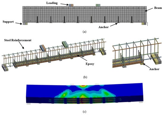 FE modeling; (a) The simulated beam, (b) Strengthening details; NSM GFRP bars, epoxy, anchor, and (c) predicted numerical failure mode.