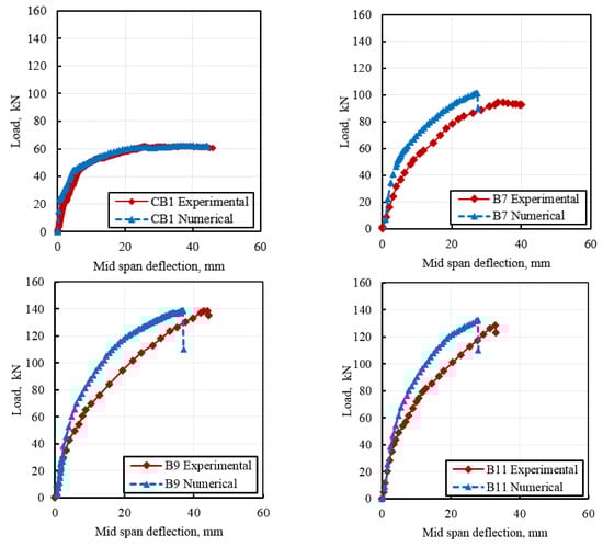 To validate the accuracy of the numerical model, a detailed comparison was made between the experimental results and the numerical simulations for RC beams CB1, B7, B9, and B11. This comparison, illustrated in Figure 8, showcased a high level of agreement between the numerical predictions and the experimental observations. Such close alignment between the two sets of results underscores the reliability and effectiveness of the numerical modeling approach employed in the study, further enhancing the credibility of the findings.