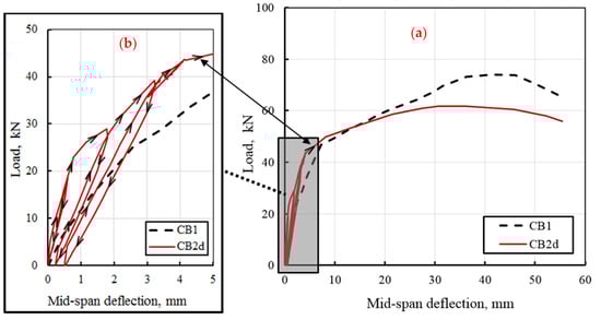 Load deflection curves for beams CB1 and CB2d; (a) fully load deflection, and (b) cyclic loading/unloading of CB2d.