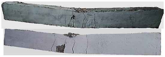 The second set of beams (Beams B3–B12) underwent cyclic loading corresponding to 0.125, 0.25, and 0.5 times the failure load of BC1 to induce damage, leading to the development of cracks in their sections resembling BC2d. Subsequently, these beams underwent four-point bending tests until complete failure, utilizing a 1000 kN capacity universal testing machine, as illustrated in Figure 6. For beams B13–B17 (third group), fresh concrete cover was applied after 28 days of curing, following the bonding conditions outlined in Table 1. Following an additional 28 days of curing for the new cover, the beams underwent monotonic static loading conditions similar to those applied to beam BC1.