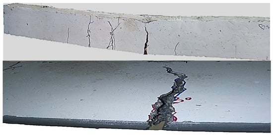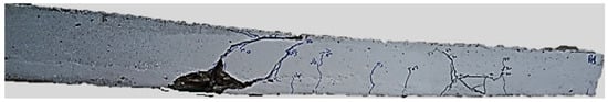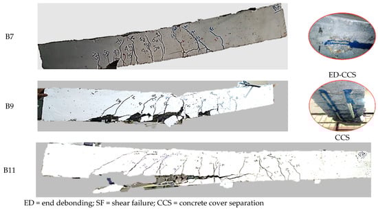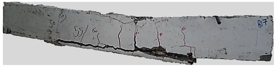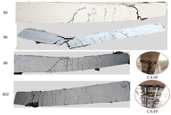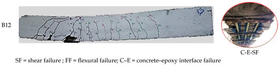 The failure mode exhibited by beam B14 is shown in Figure 23. This failure occurred due to shear failure induced by diagonal shear cracks initiated at loading points and propagated towards the end of the strengthening section. This observation of the failure mode aligns with findings from previous research studies [,,]