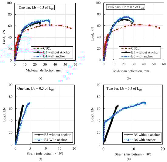 Effect of end anchor; (a) load-deflection of one bar, Lb = 0.5 of Leff, (b) load-deflection of two bars, Lb = 0.5 of Leff, (c) load-strain of one bar, Lb = 0.5 of Leff, and (d) load-strain of two bars, Lb = 0.5 of Leff.