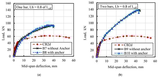 Effect of end anchor; (a) load-deflection of one bar, Lb = 0.8 of Leff, (b) load-deflection of two bars, Lb = 0.8 of Leff.
