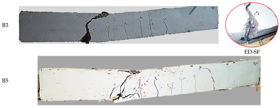 A noticeable decrease in mid-span deflection was observed when using two GFRP bars in comparison to using just one bar. The reduction in mid-span deflection is attributed to an increase in the number of bars, leading to improved resistance to stress. This increased resistance to stress results in the effective distribution of loads and stress along the length of the reinforcement, thereby enhancing its ability to carry applied loads. The Information provided suggests that the presence of end anchors has a positive impact on the maximum load of NSM GFRP bars. The anchors significantly contributed to the increase in maximum load and the decrease in mid-span deflection []. Figure 14 and Figure 15 detail the failure modes of the beams. Despite beams B3 and B4 having the same number of GFRP reinforcements, identical length, and cross-sectional area, and differing in anchor cases and peak loads, they exhibit similar failure patterns.
