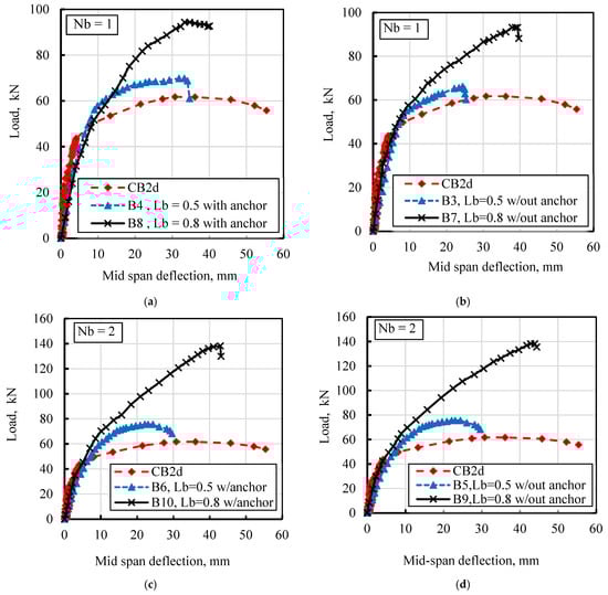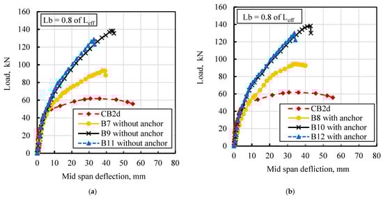 Figure 16 depicts the impact of the number of GFRP bars for a bar length (Lb) equal to 0.8 of Leff, with and without anchors. This analysis considers scenarios involving one bar with a diameter of 12 mm, two bars with a diameter of 12 mm, and three bars with a diameter of 10 mm. Notably, utilizing two bars with a diameter of 12 mm (designated as B9) resulted in a significant enhancement of the maximum load, exhibiting a 125% increase compared to the damaged reference beams CB2d. Specifically, the maximum load of beam B9 rose from 62 kN to 140 kN. Conversely, employing a single bar with a diameter of 12 mm (designated as B7) led to a 52% increase in the maximum load, elevating it from 62 kN to 94 kN. Meanwhile, the utilization of three bars with a diameter of 10 mm (designated as B11) resulted in a 106% increase in the maximum load, escalating from 62 kN to 128 kN, as illustrated in Figure 16a.