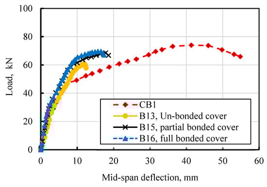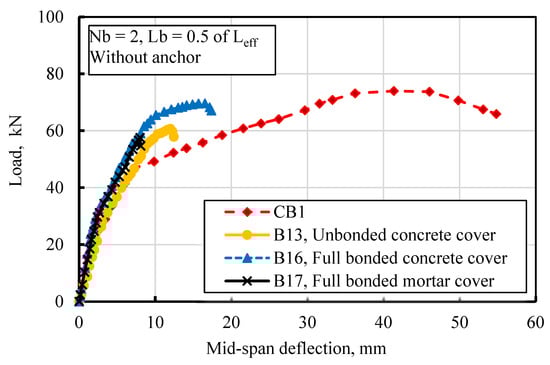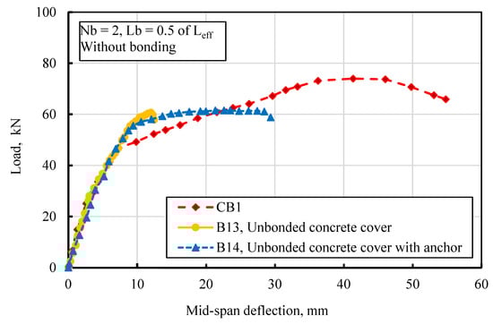 The following section presents the load-deflection characteristics and failure patterns of undamaged beams subjected to flexural loading under various concrete cover conditions, aiming to comprehend their behavior. In Figure 18, the load-deflection curve illustrates the impact of concrete cover bonding conditions for two bars with and without anchors, specifically for Lb = 0.5 of Leff. The concrete cover was applied 28 days after casting the beams.