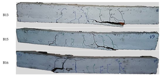 The use of concrete cover, whether in partial or full bonding, significantly enhanced the maximum load capacity of the tested beams. Depending on the type of bonding employed, the maximum load increased by up to 17%. Furthermore, concrete cover bonding contributed to the improvement of mid-span deflection, enhancing the ductility of the beam. Through this technique, the mid-span deflection increased from 12 mm to approximately 18.5 mm, depending on the bonding method, as shown in Figure 18. In general, both partial bonding and full bonding of the concrete cover strengthened the bonding and increased the maximum load compared to beams with an unbonded concrete cover. For instance, the maximum loads of beams B15 and B16 increased by 14% and 16.5%, respectively, with partial and full bonding, compared to B13 without bonding. Moreover, full bonding resulted in a 2% increase in maximum load compared to partial bonding. The mode of failure for beams B13, B15, and B16 (without anchors) is depicted in Figure 19, with diagonal cracks followed by concrete cover separation being the predominant failure mechanism.