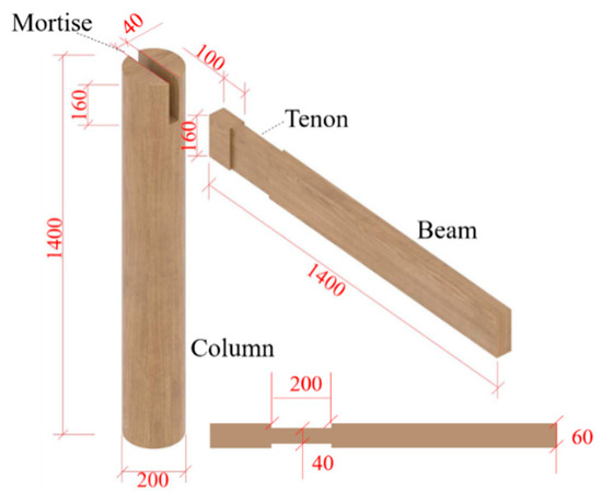 HHTMJ is crafted from Pinus kesiya var. langbianensis, a wood commonly employed in the ancient architecture of Tibetan areas in Yunnan. The average air-dry density of Pinus kesiya var. langbianensis was measured at 0.452 g/cm3, with an average moisture content of 13.3%. To determine the size of the HHTMJ used in this experiment, we referred to the HHTMJ in a Tusi Manor in the Tibetan areas of Yunnan. The column has a length of 1400 mm, a cross-sectional diameter of 200 mm, a beam section height of 160 mm, and a thickness of 60 mm, as illustrated in Figure 2. We designated the number of non-decayed specimens as ST-1 and specimens aged 6 to 24 weeks as ST-2 to ST-5.