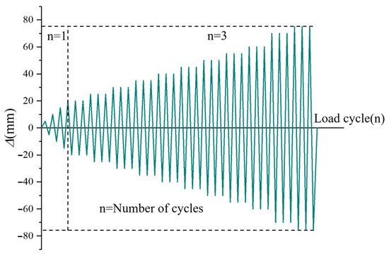 The low cycle repeated loading test refers to the provisions of JGJ/T 101-2015 “Code for Seismic Testing of Buildings” [42], and adopts displacement control-graded loading. To control the single loading before the yield section, the first three levels of loading are cycled once with an amplitude of 5 mm. After the completion of the third level of loading, the displacement of each level increases by 5 mm, and each level is cycled 3 times. When the load on the actuator decreases significantly or the node is damaged, the loading is stopped. The loading system is shown in Figure 7.