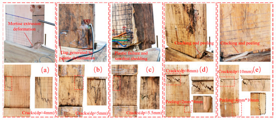 Failure mode of Tenon. (a) Deformation and fracture of specimen SJ-1; (b) Deformation and fracture of specimen SJ-2; (c) Deformation and detachment of tenon joint of specimen SJ-3; (d) Cracking and detachment of the tenon joint of specimen SJ-4; (e) Cracking and detachment of the tenon joint of specimen SJ-5.