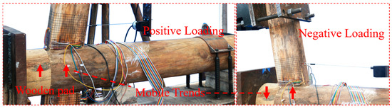 As shown in Figure 9, during positive loading, there is an upward sliding component force on the wood pad at the tenon shoulder, resulting in a tendency for both the stigma and the wood pad to slide upward, whereas during negative loading, there is a downward sliding component force on the wood pad at the tenon shoulder and a tendency for the mortise to slide downward. This makes the nodal bending moment in negative loading greater than that in positive loading. According to the research by Chang [13] et al. on HHTMJ with different degrees of damage, it was found that the phenomenon of relative slippage between the tenon eye and the wood pad would form a “pseudo-dovetail” mechanism in timber frame structures. This mechanism can provide lateral support for the timber frame, and an increase in the degree of damage weakens this mechanism. The damage pattern of the mortise is shown in Figure 10. The degree of damage at the end in contact with the wooden pad is greater than that at the end away from the wooden pad. By comparing the damage characteristics of the mortise and tenon at nodes with different decay cycles, the deformation and splitting phenomena of the head timber are more obvious with the increase in decay cycles.