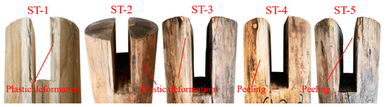 For the non-decayed specimen ST-1, during the initial loading stage, small clearances between the joints result in a relatively slow increase in load on the actuator. As loading continues, the tenon and mortise rub against each other, producing slight sounds. After unloading, no significant deformation of the projecting tenon or mortise is observed. When loaded to a displacement of 55 mm, mutual compression between the tenon and mortise leads to increased deformation of the tenon, accompanied by slight cracking sounds at the mortise with wood fibers. Upon further loading to a displacement of 75 mm, distinct wood fracture sounds are heard at the tenon, cracks form at the tenon shoulder, and the tenon exhibits noticeable plastic deformation and pullout, as shown in Figure 8a. Loading is then stopped.