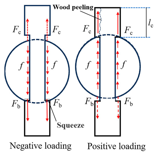 Figure 12 presents the stress analysis of the HHTMJ cross-section, shedding light on the occurrence of wood chip-off at the tenon shoulder and extrusion deformation of the wood at the mortise edge during larger loading displacements. During negative loading, the post head applies force Fb to the tenon shoulder. Referring to Figure 11 makes it evident that stresses become more concentrated the farther they are from the tenon center. This concentration leads to increased susceptibility of the wood at the edge of the tenon shoulder to plastic deformation. In the case of forward loading, the wood size at the CD end of the HHTMJ tenon is smaller. The tenon shoulder’s edge is prone to plastic deformation when subjected to the concentrated force Fc. The tenon shoulder generates significant paragrain shear stress, and the wood paragrain shear strength decreases with a large decay cycle and a small length lc of the upper end of the tenon. This reduced paragrain shear resistance contributes to the woodshedding at the edge of the tenon shoulder in the paragrain direction.