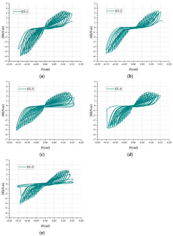 For specimens ST-4 and ST-5, similar to specimen ST-3, slight plastic deformation and wood chips were shedding at the tenon shoulder during the initial loading. At a loading displacement of 50 mm, specimen ST-4 experienced a notable release of wood chips from the tenon shoulder. When the loading displacement reached 65 mm, the tenon emitted a small sound of wood breaking, and at a continued displacement of 70 mm, a substantial fracture occurred in the tenon. Upon loading to a displacement of 75 mm, the tenon displayed severe plastic deformation and damage, leading to the cessation of loading. The characteristics of node damage are illustrated in Figure 8d. For specimen ST-5, when loaded to 45 mm, a smaller wood fracture sound occurred at the tenon, and the crack gradually expanded with the increasing loading displacement. At a loading displacement of 60 mm, the wood pieces at the tenon shoulder of specimen ST-5 detached in one piece along the grain direction, accompanied by a slight wood fracture sound at the tenon during forward loading. By the time the load reached 70 mm, the tenon emitted a loud sound indicating wood fracture, and visible cracks appeared at the tenon. The actuator showed a significant decrease in load value. Continuing to a load of 75 mm, the actuator load remained nearly unchanged, while the tenon was destroyed. Loading was promptly halted, and the failure characteristics of the node are depicted in Figure 8e. A comprehensive analysis of the information reveals that with the increase in the decay period, the primary failure mode of HHTMJ under the same load level has not undergone significant changes, mainly displaying fracture failure at the tenon shoulder. However, the extent of damage is increasing, and the failure mode is becoming more complex.