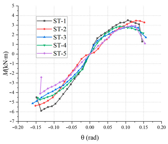 According to the provisions in the Technical Standard for Maintenance and Reinforcement of Wooden Structures of Ancient Buildings (GB/50165-2020) [45], the limit value of the interstorey displacement angle of the wooden structure building is 1/30. In the Tusi Manor in Tibetan areas in Yunnan, the deformation of the internal wooden frame is mainly caused by the deformation of the mortise and tenon nodes, and it can be regarded as the limit value of the rotational performance of the hoop-and-tenon nodes of 1/30. As can be seen from Figure 13, the node bending moment of specimen ST-5 still rises when the loading angle is 0.12 rad (about 1/8), which indicates that the HHTMJ with decay still has a good rotational performance.
