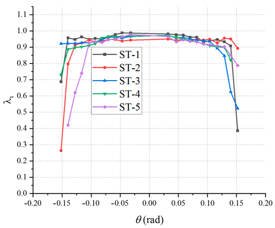 where λi is the strength degradation factor of the i-th loading level; Pi,1 is the peak load value of the first cycle in the i-th loading level, and Pi,3 is the peak load value of the third cycle in the i-th loading level. The variation rule of the strength degradation factor of each node calculated by Equation (3) is shown in Figure 15 below.