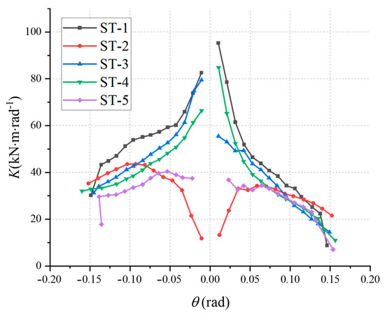 where Ki is the cut line stiffness under the action of the loading displacement of the i-th level; Mi is the peak point bending moment under the action of the loading displacement of the i-th level; θi is the node turning angle corresponding to Mi. The rotational stiffness of each node is calculated by Equation (4), as shown in Figure 16.