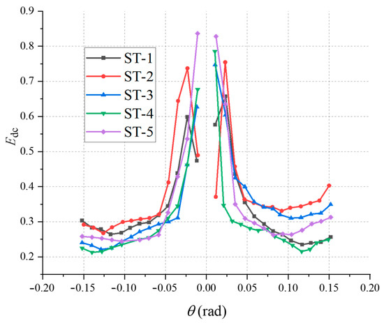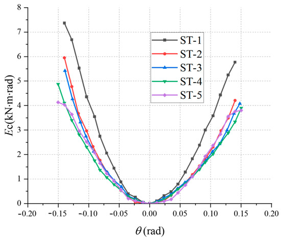 The energy dissipation capacity of the HHTMJ is indicated by the envelope area of the hysteresis curve, and the cumulative energy dissipation (Ec) for the experiment’s mortise-tenon joint is obtained by summing the hysteresis curve’s area [43]. The results for the cumulative energy dissipation coefficient of the HHTMJ are depicted in Figure 17 through the calculation of the envelope area of the hysteresis curve. Examination of the figure reveals that, during the pre-loading period, the cumulative energy dissipation of each specimen increases gradually, with the cumulative energy dissipation values for positive and negative loading being essentially symmetrical. With an increase in loading displacement, joint energy dissipation accelerates, reaching its maximum value when loading leads to specimen destruction. In comparison to specimen ST-1, specimens ST-2, ST-3, ST-4, and ST-5 exhibit a decrease in cumulative energy dissipation by 21.6%, 27.4%, 33.2%, and 41.3%, respectively. The occurrence of decay has a more significant impact on the cumulative energy performance degradation of the HHTMJ, while the increase in the degree of decay has a comparatively smaller effect on the cumulative energy performance degradation of the HHTMJ.