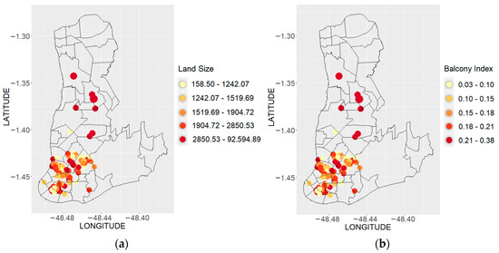 The historic factor of Belém’s urban development also plays a significant role in explaining this result. HDUs with lower per capita incomes tend to exhibit less verticalization and are often avoided by the middle and high-end real estate market [17]. As a result, the neighborhoods with a higher number of buildings, such as Batista Campos, Marco, Nazaré, and Umarizal, consequently exhibiting a greater mean balcony index, are often situated in HDUs with high per capita incomes.