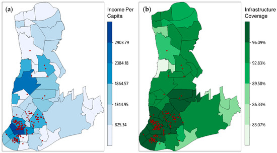 Additionally, the absence of significance found for the variable related to infrastructure coverage (INFRA) in both OLS and SLM models shows that this result can be associated with the homogeneity present in the distribution of this variable, as shown in Figure 4b. Therefore, although urban infrastructure is a determining factor for the economic development [31,32] and the consequent exploitation of the region by the real estate market [34], its uniformity in the sample under analysis may explain the lack of a discernible impact on the dependent variable of the models.