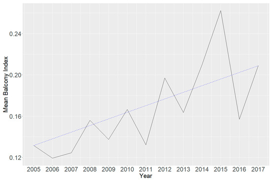 With regard to the control variable “Year”, we emphasize the upward trend in the balcony index of the UHs. From 2005 to 2017, the buildings in our sample showed an oscillation in the BI, with an average variation of seven percentage points. We, therefore, postulate that, like per capita income and infrastructure, this variable is statistically significant in our research context.