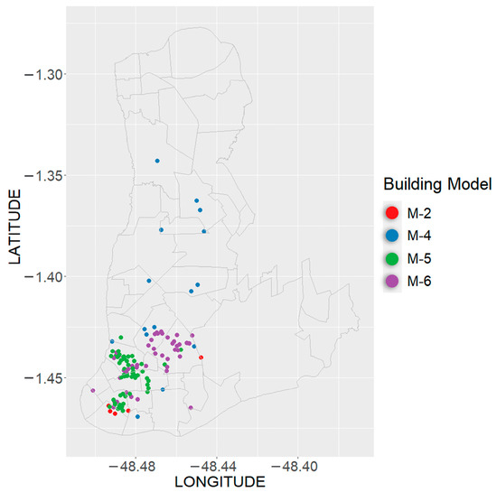 According to Annex V of the UMP, which was made available by the city council, Belém’s urban territory is segmented into seven urban environment zones (UEZ) (Zonas de Ambiente Urbano—ZAU) based on specific landscape and urban occupation patterns, urban problems, and potential and specific objectives [19]. UEZ3 and UEZ6 are subdivided into sectors (Sectors I to V). In line with the aim of this study and following Annex X of the UMP, the focus of this paper is on multi-family housing. Thus, distributed between UEZ1 and UEZ6, there are five types of urban models (UMs)—UM2 to UM6—as shown in Table 1.