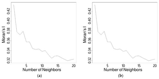 To evaluate the presence of spatial autocorrelation in the data, Moran’s index was used []. The value of Moran’s index ranges from −1 to 1, where a positive/negative value suggests positive/negative spatial autocorrelation or the presence of clusters in an observed area. Thus, analysis of the Moran index determines whether the rental price of an apartment in the sample is influenced by the proximity of neighboring apartments, with this having a positive or negative impact on its variation. The neighborhood matrix associated with the Moran index was computed using the k-nearest-neighbors approach [].