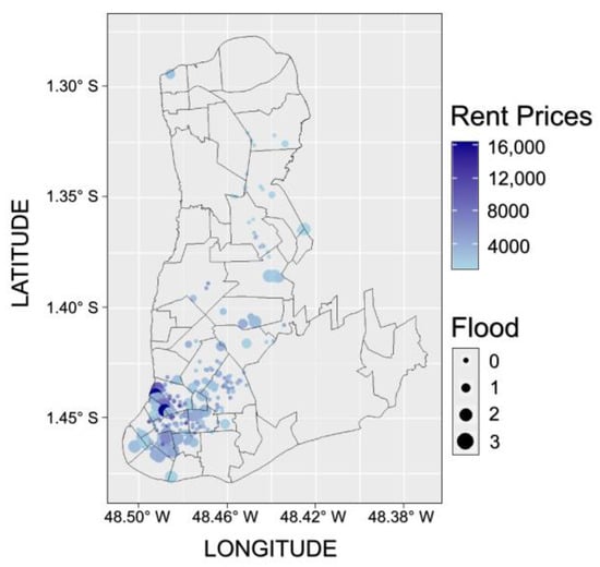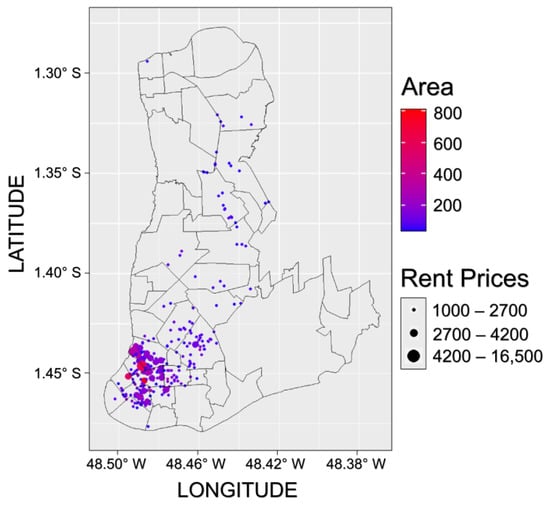 Therefore, the scarcity of similar studies in the Amazon region, particularly in Belém, aligned with the unique cultural and socioeconomic dynamics of the area, encourages the implementation of hedonic approaches—both traditional and spatial—in its real estate sector. According to data available from the National Continuous Annual Household Sample Survey (Pesquisa Nacional por Amostra de Domicílios Contínua Anual) [], approximately 17% of the existing households in Belém are rented. Research in which the determinants of rental prices are identified in emerging markets is important for policymakers, as it provides information about the real estate market, which translates into better formulation of housing policies [].