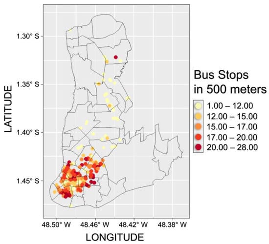 Furthermore, some variables related to the location of the apartments were incorporated into the database, with the aim of analyzing the influence of locational characteristics on the variation in rental prices. To carry out this analysis, service and recreational amenities in the mainland region of Belém were mapped using the Google Maps website. The geographical coordinates of 1625 bus stops, 160 hospitals, 79 supermarkets, and 5 shopping centers were obtained.