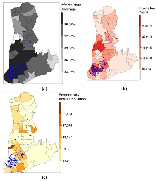 Thus, the socioeconomic influence was incorporated by including the variables “pci” (per capita income in BRL/inhabitant) and “activ_pop” (number of people in formal employment). In addition, the influence of infrastructure was quantified by the “infra” variable, which is defined as the arithmetic mean of four indicators: (1) the percentage of households served by a public water supply; (2) the percentage of households served by an electricity supply; (3) the percentage of households served by an adequate sewage distribution system; and (4) the percentage of households served by waste collection and disposal services.