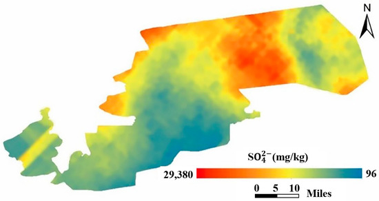A prior study [6] found that the Tumushuke area’s saline soils were primarily sulfite saline soils, with 29,380 mg/kg of being the highest concentration in this area. The trend of “high in the east and low in the west” and “high in the north and low in the south” was generally evident in the horizontal distribution of soil salinity, with the northeastern region of Tumushuke exhibiting the highest concentration. Its specific distribution is shown in Figure 1.