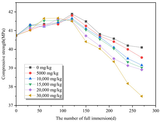 In comparison to immersion for 0 d, the specimens’ compressive strength decreased by 1.57%, 2.90%, 3.90%, 4.22%, 4.49%, and 7.98% at the erosion age of 270 d. That is, after about 120 d, the higher the sulfate concentration, the smaller the compressive strength values of the eroded concrete specimens, and the higher the sulfate concentration, the longer the age of erosion, and the faster the rate of compressive strength decrease.