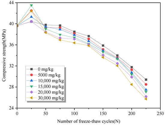 As illustrated in Figure 3, specimens of concrete exhibit a slight gain in compressive strength at 25 freezing and thawing cycles, which is followed by a drop in the specimen’s compressive strength as the number of cycles increases. The increase in compressive strength at 25 freeze–thaw cycles is due to the reaction of sulfate with cement hydration to form the hydration products ettringite and gypsum, which in turn fill the pores within the concrete and are not sufficient to cause expansion cracks in the specimens. On the other hand, a higher densification of the specimen will lead to a higher compressive strength. At 225 cycles of freeze–thaw, the specimens’ compressive strengths are 74.19%, 71.89%, 69.34%, 68.38%, 66.09%, and 64.93% of their original strengths, in that order. It is evident that the specimen’s compressive strength value steadily drops as the sulfate solution concentration rises; in other words, the greater the sulfate solution concentration, the lower the specimen’s compressive strength value during the freeze–thaw cycle test.