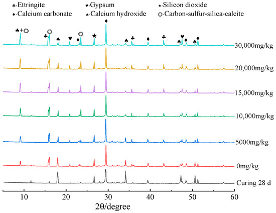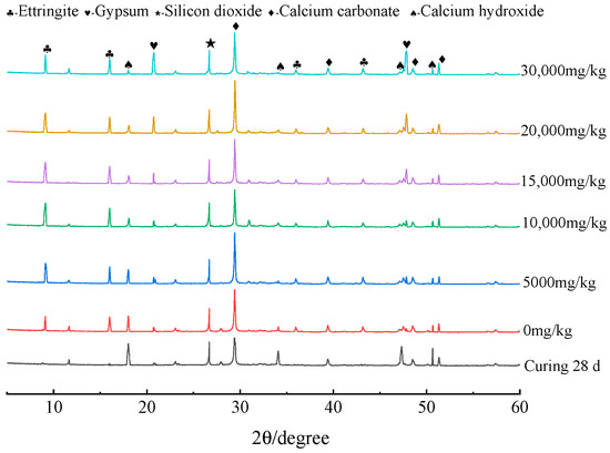 The XRD test results are shown in Figure 4. It is evident that the concrete specimens that were cured with deionized water for 28 days contained SiO2, CaCO3, Ca(OH)2, and small ettringite diffraction peaks. Additionally, aggregates were the primary cause of the CaCO3 and SiO2 diffraction peaks, which were relatively high and stable. The Ca(OH)2 diffraction peaks, on the other hand, became weaker and the diffraction peaks of ettringite and gypsum manifestly strengthened after the specimens were submerged in the sulfate solution for 270 days. This was because of a chemical reaction that occurred between the sulfate that entered the concrete’s interior and the cement’s hydration products. In the process, the specimen’s Ca(OH)2 was consumed, and erosion products like ettringite and gypsum were produced. These products showed up macroscopically as the specimen deteriorated and was destroyed [20,21]. Soaking in the sulfate-containing (138 mg/L) local groundwater produced ettringite diffraction peaks in concrete specimens with an concentration of 0 mg/kg.