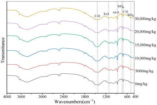According to currently available research [34,35], [AlO6] occurs at approximately 850 cm−1, the S-O stretch occurs at approximately 1100 cm−1, and the O-H stretch occurs at approximately 3600–3200 cm−1. The bands that occur at 1420, 874, and 710 cm−1 and are attributed to the asymmetric v3 and symmetric v2 and v4 of C-O allow one to identify the . The appearance of the C-O bands at 1465 and 874 cm−1 confirms the carbonation of the ettringite [36]. Figure 6 displays the results of infrared spectrogram tests conducted to further identify the kind of erosion products after the concrete specimens were submerged for 270 days at various sulfate concentrations. The appearance of C-O vibrational stretching peaks at 423 cm−1 and 715 cm−1 can be observed, suggesting the existence of group-containing compounds in the specimens. This is a result of calcium carbonate being the primary component of aggregate. The existence of several -containing groups in the specimen was indicated by the appearance of an S-O vibrational stretching peak at 1134 cm−1. An Al-O vibrational stretching peak at 848 cm−1 suggests that the sample contains [AlO6] groups. The above illustrates the generation of calcite and gypsum inside the concrete specimens following their 270-day immersion in a sulfate environment. Moreover, the vibrational telescoping peaks of the individual chemical bonds gradually increased as the sulfate concentration increased, indicating an increase in the content of the individual substances.