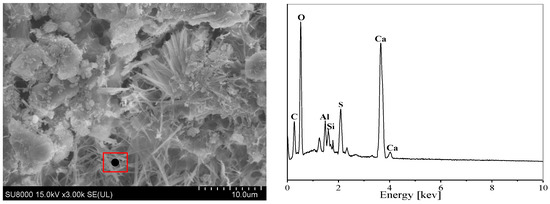 Figure 8 and Figure 9 (The energy spectrum plot on the right is obtained from the black dots in the red box.) display the SEM and EDS of the immersed concrete. The erosion products are primarily found in the interfacial zone and pores/cracks of the concrete specimens. This is mostly because the matrix of concrete is comparatively more porous than that of mortar, which facilitates the passage of calcium ions, phases containing aluminum, and sulfate ions. The buildup of erosion products causes the internal concrete specimen expansion strains, microcracks, and bonding of the internal concrete material to decrease. As a result, cracks appear, the concrete specimen’s macroscopically mechanical strength declines, and its microstructural strength is compromised. As can be seen from Figure 8 and Figure 9, when the concentration is 0 mg/kg, the concrete specimens are well hydrated after 28 days of curing, and the internal micro-morphology is structurally dense, but there are also initial micro-cracks existing. The concrete specimens have a significant amount of intact Ca(OH)2 crystals, as well as a substantial number of flocculent hydration products (C-S-H) filling the pores and microcracks within them, according to SEM imaging.