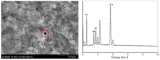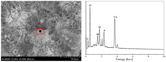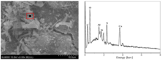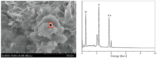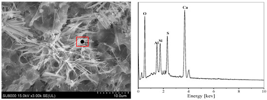 The EDS energy spectra and microscopic morphology of concrete specimens submerged in various sulfate concentration solutions for 270 days are displayed in Figure 10, Figure 11, Figure 12, Figure 13, Figure 14 and Figure 15. It can be observed that the acicular ettringite in the concrete pores is fibrously connected at low sulfate concentrations. Ettringite crystals gather in huge quantities in the pores and fissures at the boundary when the sulfate concentration rises, mostly as clusters or needle-like multiple interwoven roots. This ettringite in clusters has an excellent crystalline shape, grows from the pore’s edge to its interior, absorbs water easily, enlarges, and frequently forms clusters perpendicular to the fissure’s surface. This results in high internal tensions, which weaken the aggregate’s attachment to the concrete specimen’s paste and deteriorate qualities of the concrete. In the later stages of erosion, swelling materials continue to form, and the stresses induced by ettringite and gypsum are transferred to the cement matrix, leading to interfacial cracking [41]. Simultaneously, as the specimens gradually develop more fractures, more ions diffuse into the interior of the concrete, and more erosion products are formed.