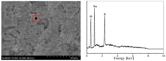 As illustrated in Figure 16, many petal-like crystals are also discovered in micro-morphological studies at a concentration of 30,000 mg/kg on the concrete specimen’s edge. Based on energy spectrum research, the composition of these petal-like crystals is primarily Na, S, and O, suggesting that they are crystals of sodium sulfate. This suggests that, particularly at high concentrations of sulfate solution, the process of sulfate assault is also followed by the crystallization of sodium sulfate, as seen by the white coating of crystalline salt that covers the outside of the concrete test samples.