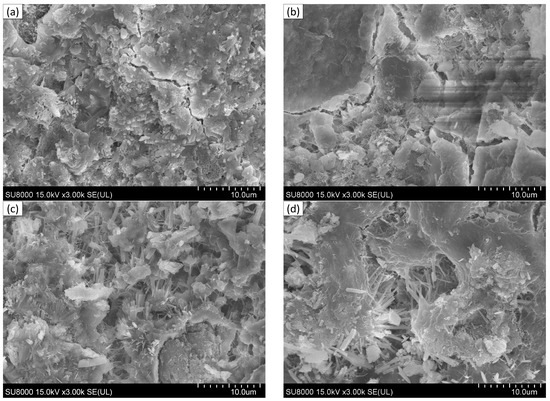 Upon 225 cycles of freezing and thawing at six different sulfate concentrations, the concrete specimens exhibited noticeable fractures, as depicted in Figure 17, and many needle-shaped, short columnar crystals surfaced at the crack’s periphery. The SEM reveals that the products were calcite and gypsum. The appearance of these fissures in the concrete specimens made it easier for environmental to infiltrate the inside of the specimens. infiltrated the concrete specimens’ pores by differential pressure infiltration. This resulted in a rise in the concentration of in the concrete specimens’ pores, as well as an increase in the number of ettringite crystals and the formation of gypsum crystals. The large-scale growth of its products occurred mostly in the pores and boundaries of concrete, where they coexisted with fractures. Microcracks in the concrete specimen occurred when the expansion stress of the erosion products surpassed the tensile strength of the specimen. The specimen’s internal cracks enlarged and widened as the coupling action went on, damaging the concrete specimen’s structure and drastically lowering its strength.