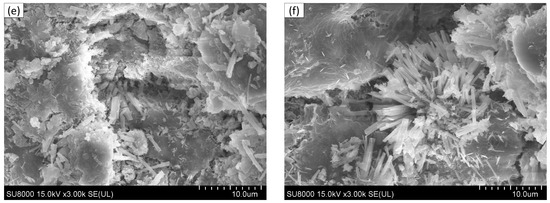 SEM images of concrete specimens after 225 freeze–thaw cycles. (a) 0 mg/kg; (b) 5000 mg/kg; (c) 10,000 mg/kg; (d) 15,000 mg/kg; (e) 20,000 mg/kg; (f) 30,000 mg/kg.