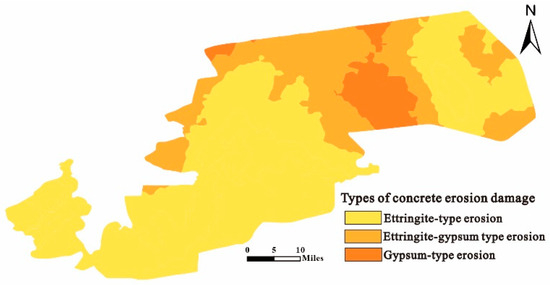 - The Tumushuke area’s southern and northeastern regions have low sulfate concentrations and primarily exhibit ettringite–gypsum-type erosion damage. In contrast, the center north has high sulfate concentrations and primarily exhibits gypsum-type and ettringite–gypsum-type erosion damage.