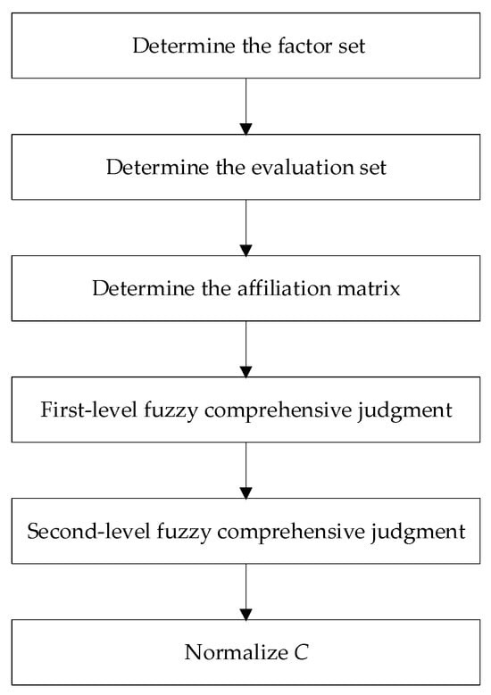 Fuzzy comprehensive evaluation method was used for the resilience evaluation for construction management of major railway projects [,], and its main steps are shown in Figure 2.