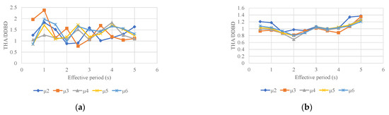 In this section, the results obtained through the two approaches described in Section 2.2.3 are reported. In particular, the values shown below are the average results related to the twelve accelerograms used for each hysteretic model. The displacement ratio (DR, intended as the ratio between the displacement provided by time-history analysis and the target displacement obtained by DDBD procedure) has been plotted (Figure 4 and Figure 5) against the effective period for different ductility levels.