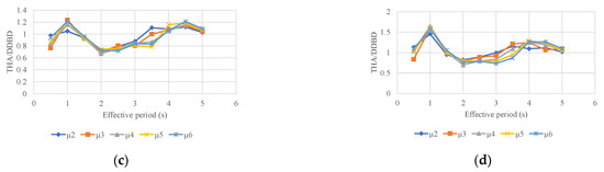 It can be noticed that this is an underestimation of the equivalent damping obtained by using Equations (11)–(14). In this case, the formulation used to evaluate the equivalent viscous damping leads to smaller displacements than the ones obtained from nonlinear time-history analysis. It can be noted that the agreement is better for the models characterized by a lower hysteretic energy (see the Takeda “narrow” model in Figure 4c) where the average ratio is generally within ±15% of the unity. In general, it is not possible to identify a clear trend in the DR as a function of the ductility level, even if in Figure 4b–d it seems there is a lower dependency on ductility level than in Figure 4a. In the case of models characterized by a larger hysteretic energy, as in the case of the EPP model, the average values of the ratio are much greater than the other cases, up to twice the unity.