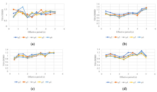 Time-history analysis/DDBD displacement average ratio using approach 1 and a set of synthetic accelerograms: (a) EPP (r = 0), (b) bilinear (r = 0.2), (c) Takeda model (“narrow” type, α = 0.5, β = 0.0, r = 0.05), (d) Takeda model (“fat” type α = 0.3, β = 0.6, r = 0.05).